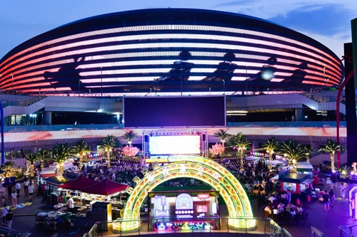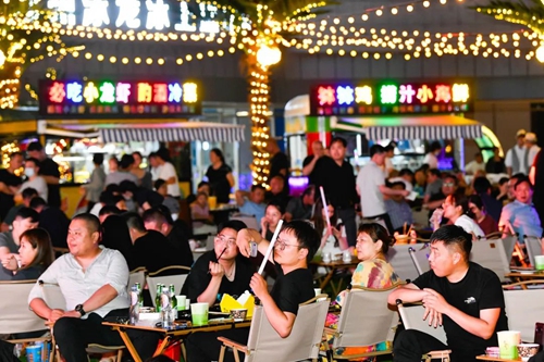 熠熠星光耀向夜空,呼應著霓虹閃爍的奧體中心,飄散的煙火氣和美食的香氣充斥著整個下沉空間,舞臺音樂節奏歡快、火爆酷炫,在霓虹交錯的空間里,一天的時間仿佛被夜市拉長,這是年輕人帶給這座城市的無限活力。