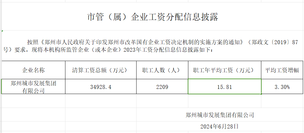 鄭州城市發展集團有限公司2023年薪酬情況