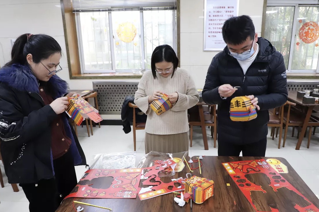 在DIY手工燈籠制作時,大家各自拿著半成品材料對照參考說明進行粘貼制作。相互交流、相互指導,通過一步步的搭建、固定、粘貼,最終象征著喜慶、團圓的萌虎燈籠逐一呈現眼前。